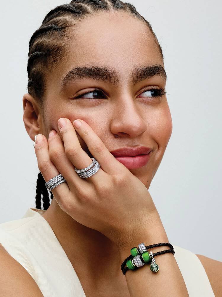 Embellece tus manos con el Anillo Barra silver con Logo Combinable. Este anillo en plata de primera ley se presenta con una forma geométrica, una estética minimalista y el icónico logo grabado encima de una barra plana. En el interior, una hilera de corazones le aportan textura y en el exterior, el brillo del metal pulido crea un juego de luz. Su fino perfil está pensando para ser combinado con el resto de tus otros anillos favoritos.