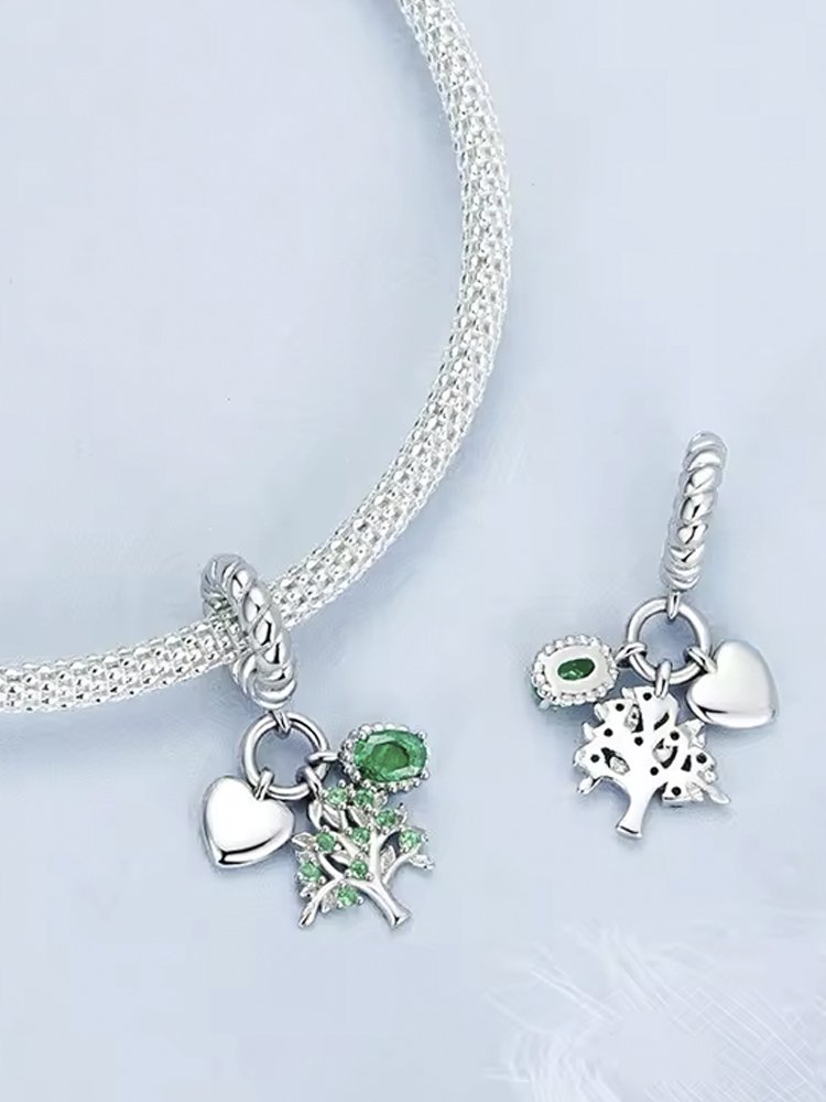 Charm Colgante Triple Corazón, Árbol de Vida y Circonitas Verdes